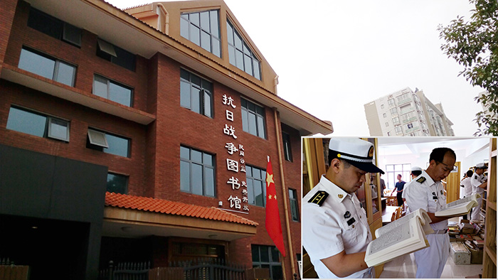 湖南炎德文化實業(yè)有限何譽軍創(chuàng)建的抗日戰(zhàn)爭圖書館。右下圖為海軍某部官兵到抗日戰(zhàn)爭圖書館參觀學習。