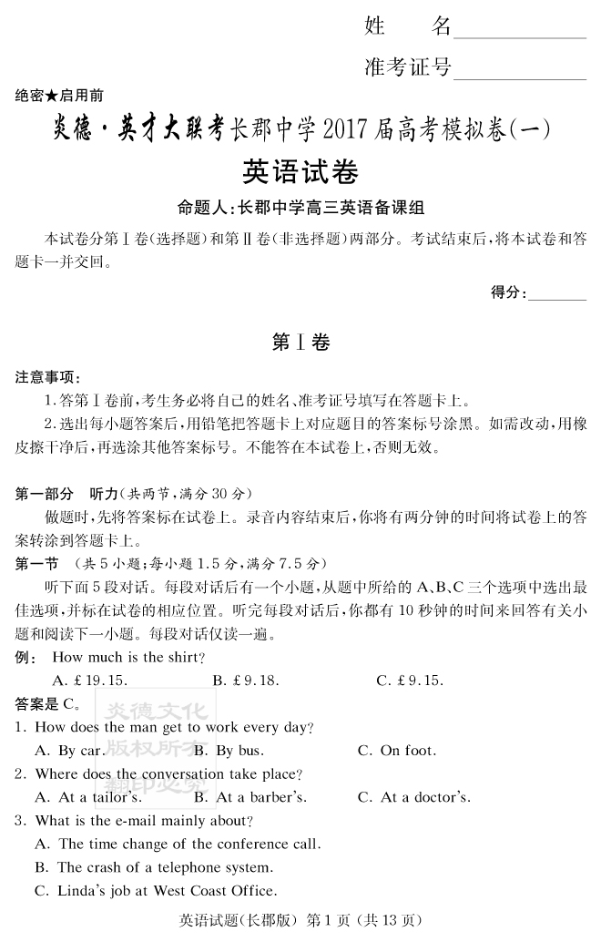【英語】炎德英才大聯(lián)考2017長郡中學(xué)高三9次月考(模擬一)