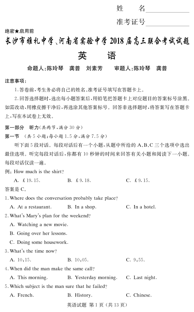 【英語】炎德英才大聯(lián)考2018雅禮中學(xué)高三9次月考