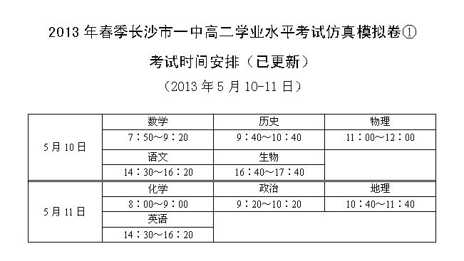 下一篇:2013年春季長沙市一中高二學業水平考試仿真模擬卷②考試時間安排(2013.05.31-06.02)