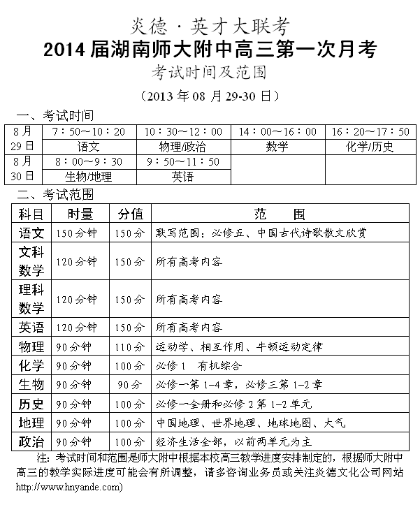 炎德英才大聯(lián)考師大附中2014屆高三第1次月考考試時間和范圍(2013.08.28-29)