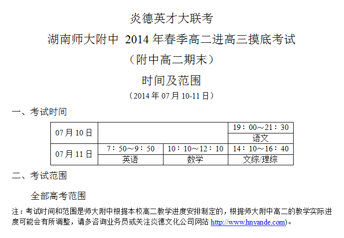 2014年春季師大附中高二期末考試(高二進高三摸底)時間及范圍(2014.07.10-11)
