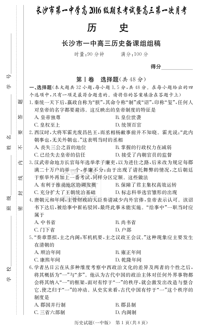 2026長郡中學新高考考前小題沖刺訓練·歷史