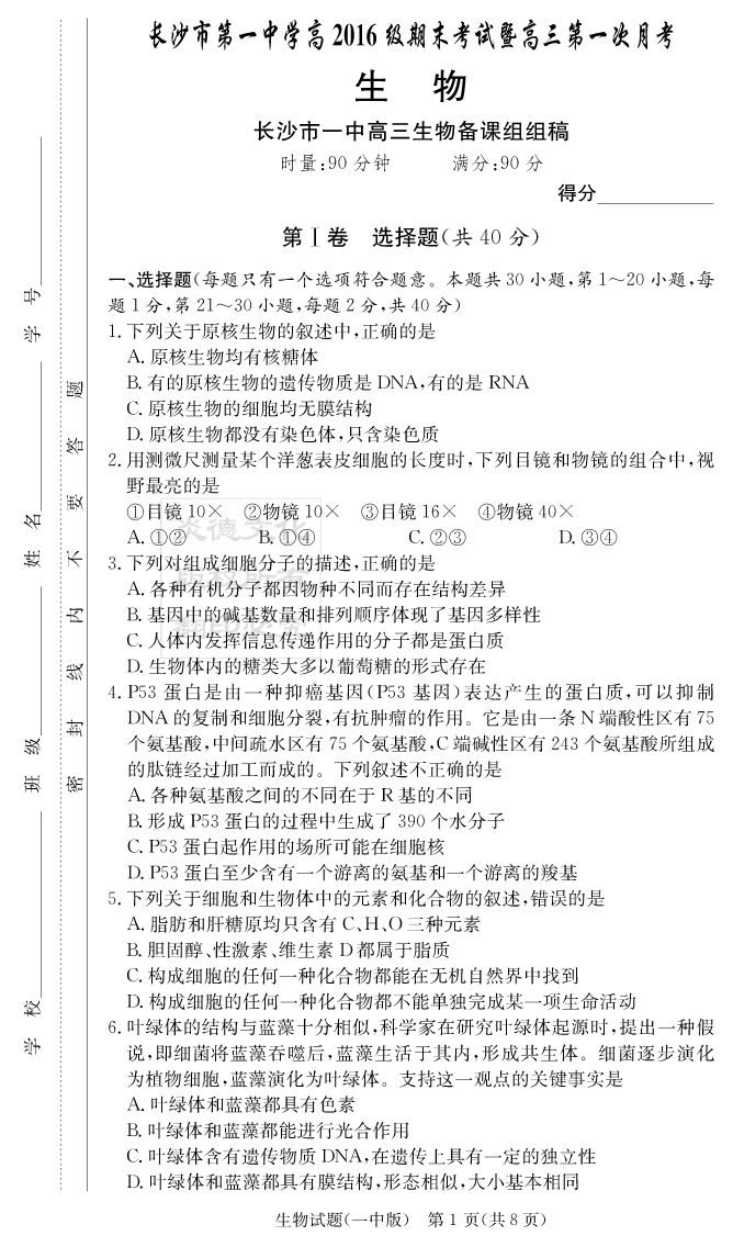 【生物】炎德英才大聯(lián)考2019長(zhǎng)沙一中高三1次月考