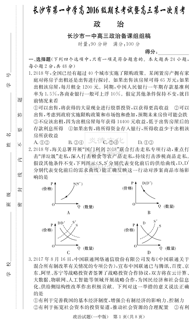 2026長郡中學新高考考前小題沖刺訓練·政治