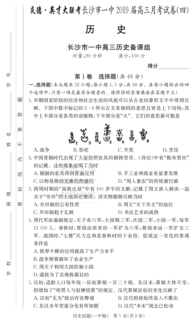 【歷史】炎德英才大聯考2019長沙一中高三4次月考
