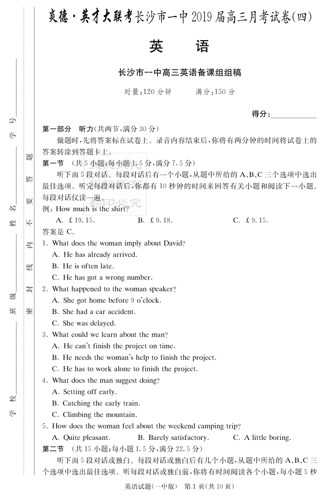 【英語(yǔ)】炎德英才大聯(lián)考2019長(zhǎng)沙一中高三4次月考