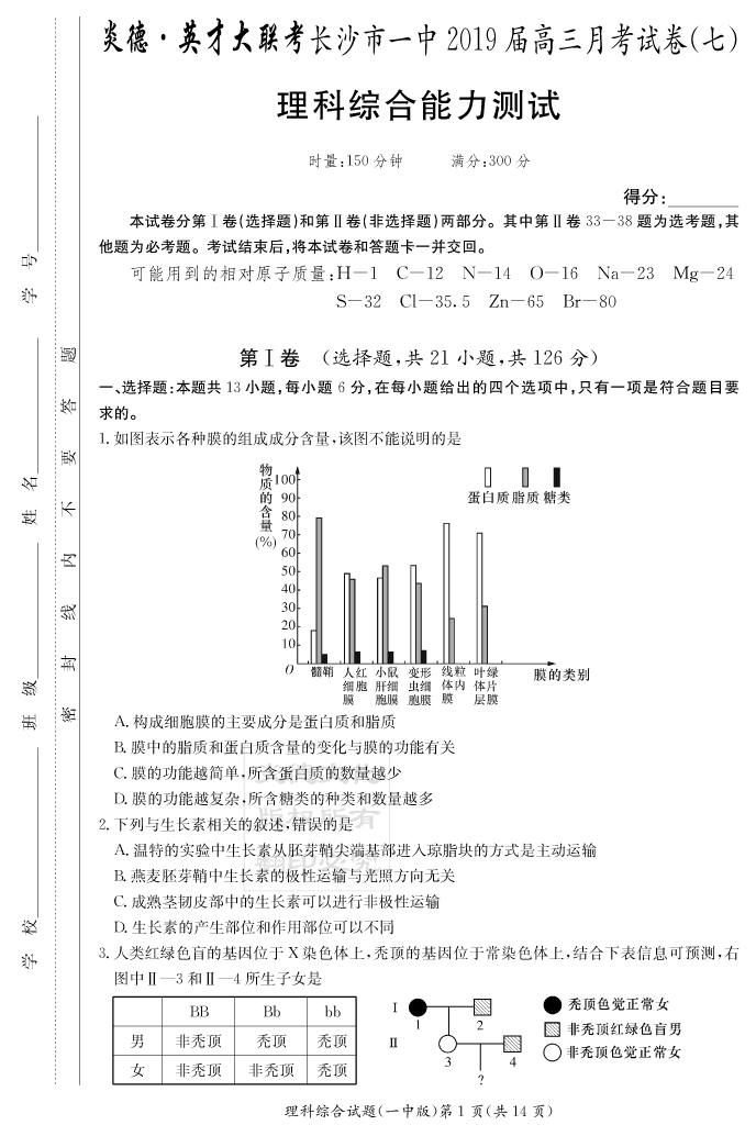 【理綜】炎德英才大聯考2019長沙一中高三7次月考