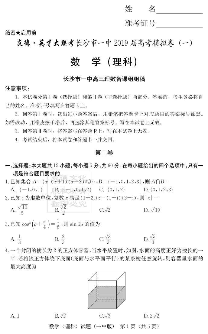 【理數】炎德英才大聯考2019長沙一中高三10次月考(模擬一)