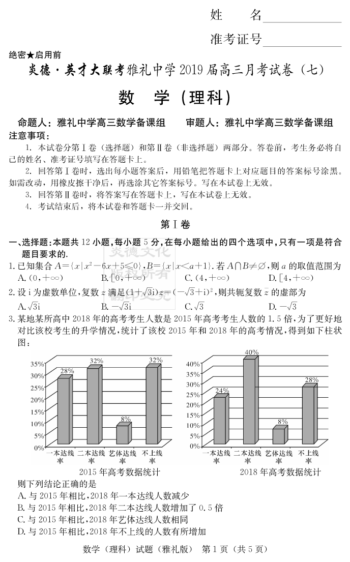 【理數】炎德英才大聯考2019雅禮中學高三7次月考
