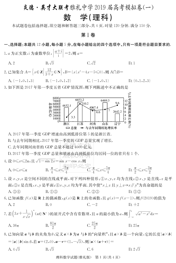 【理數(shù)】炎德英才大聯(lián)考2019雅禮中學(xué)高三9次月考(模擬一)