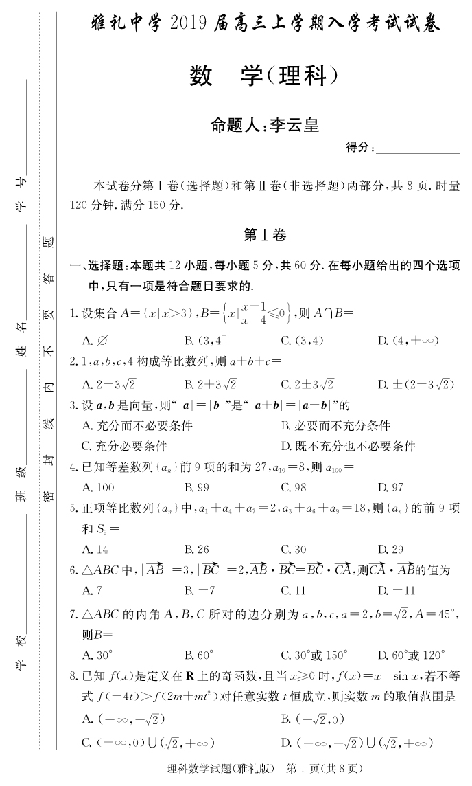 【理數(shù)】雅禮中學2019屆高三上學期入學考試