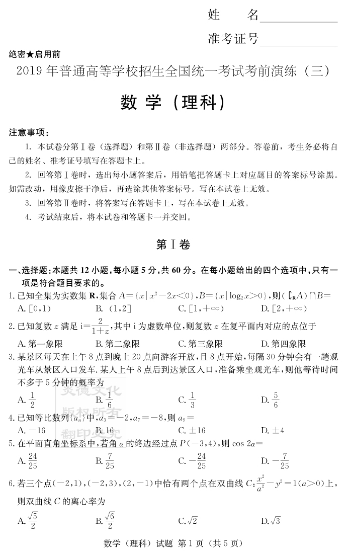 【理數】2019年普通高等學校招生全國統一考試考前演練(三)