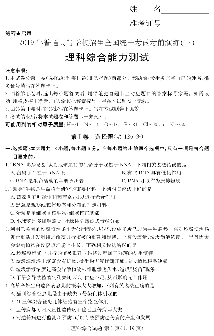 【理綜】2019年普通高等學校招生全國統一考試考前演練(三)