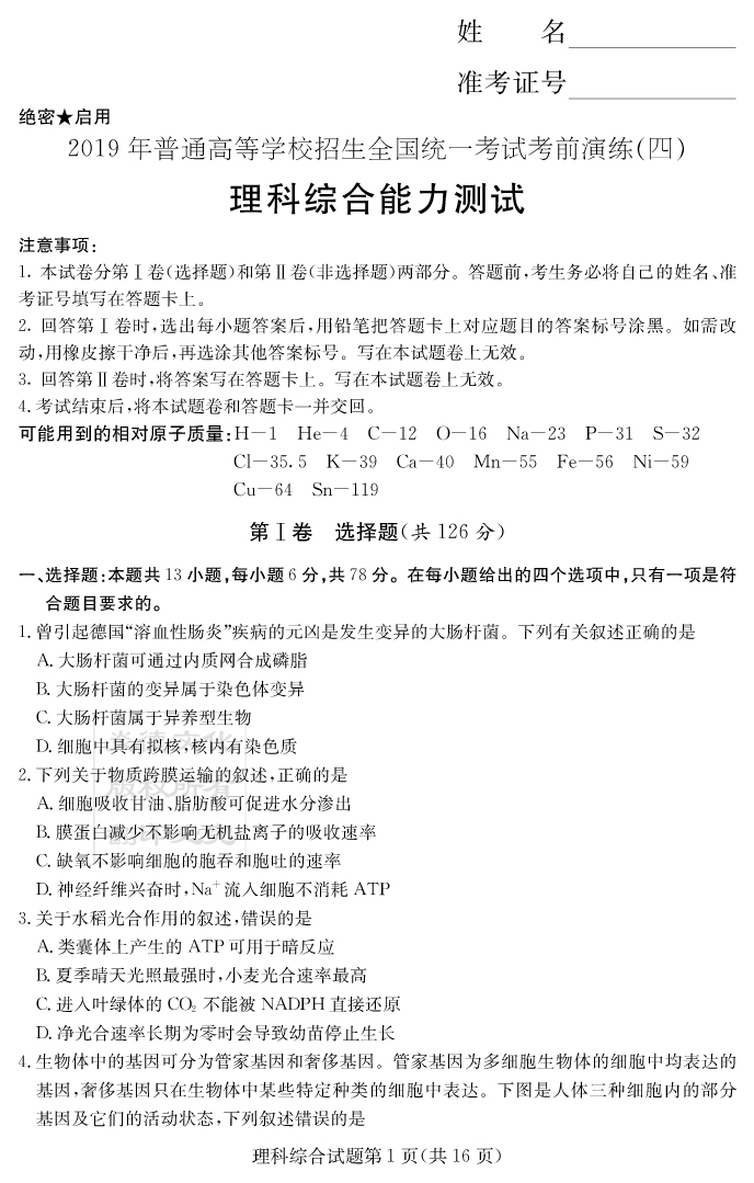 【理綜】2019年普通高等學(xué)校招生全國(guó)統(tǒng)一考試考前演練(四)