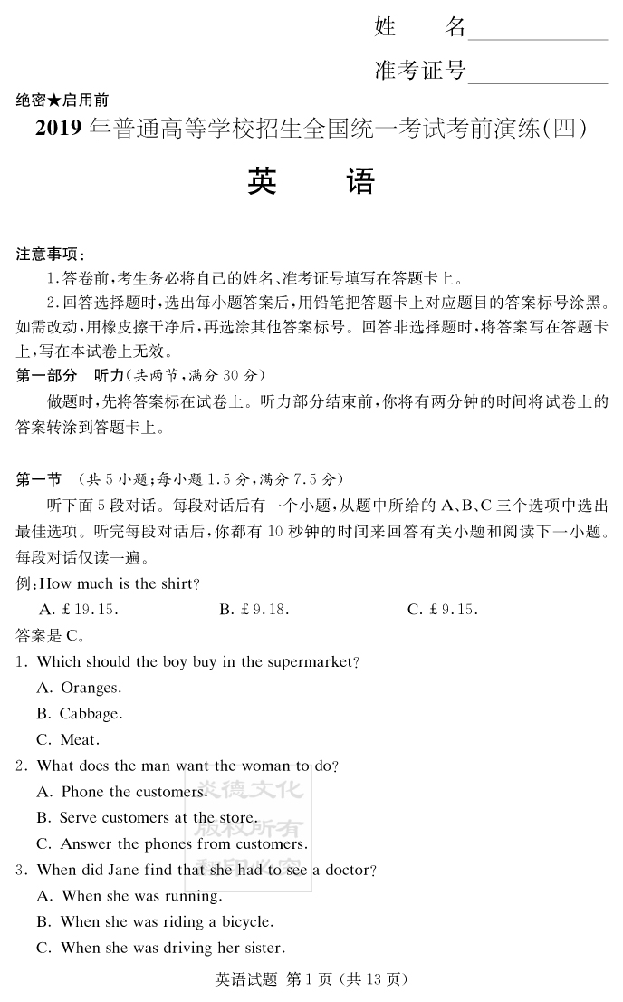 【英語(yǔ)】2019年普通高等學(xué)校招生全國(guó)統(tǒng)一考試考前演練(四)