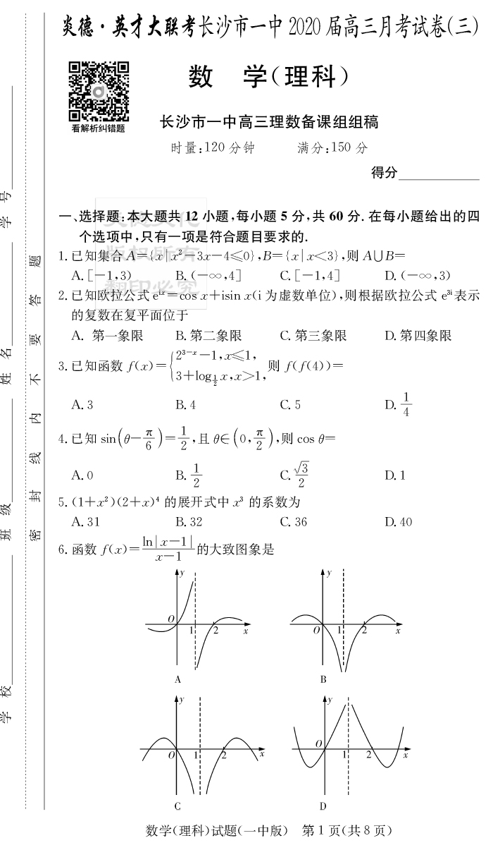【理數】炎德英才大聯考2020屆長沙市一中高三3次月考