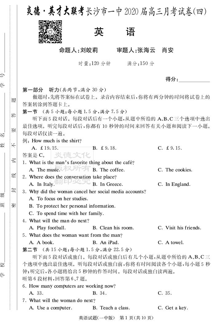 【英語】炎德英才大聯考2020屆長沙市一中高三4次月考