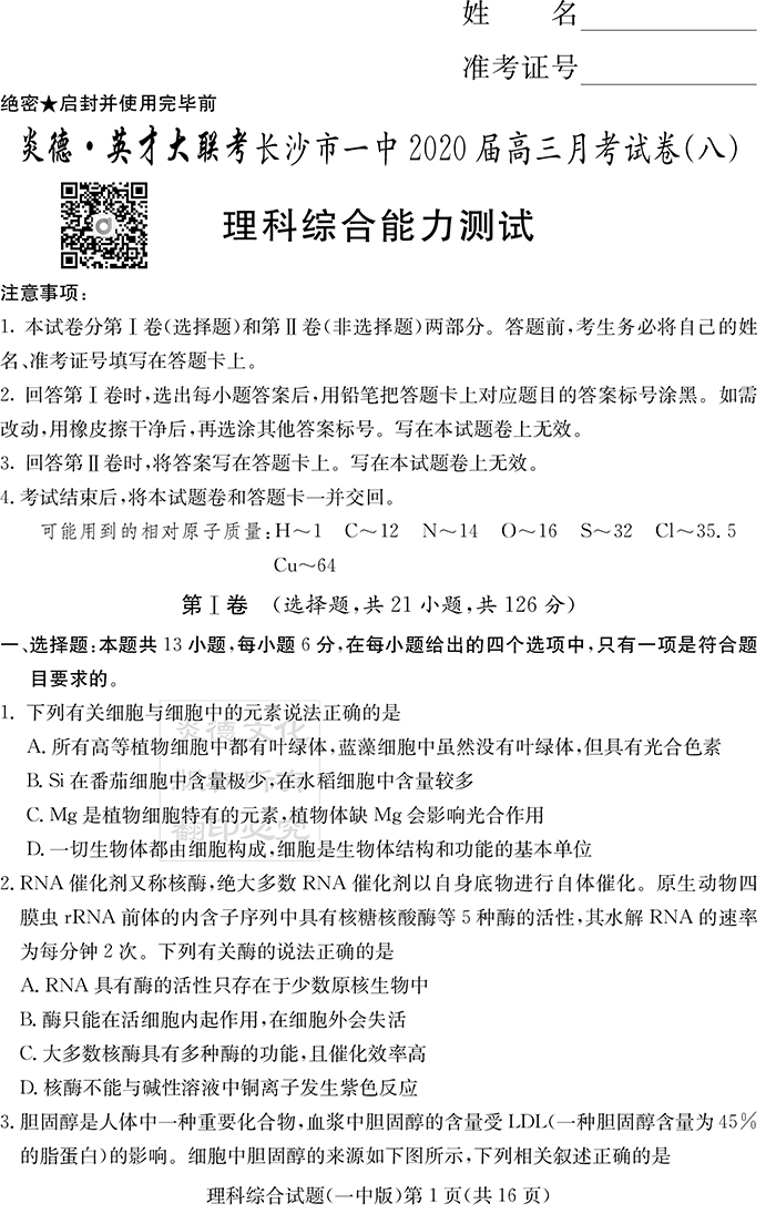 【理綜】炎德英才大聯考2020屆長沙市一中高三8次月考