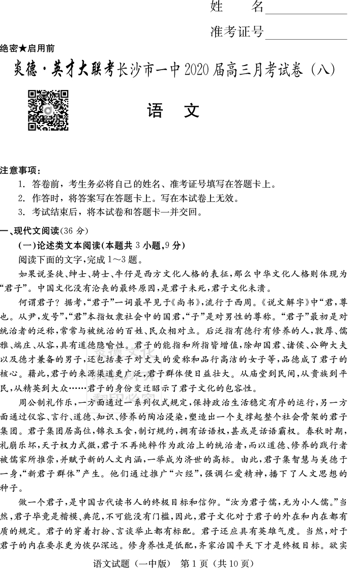 【語文】炎德英才大聯(lián)考2020屆長沙市一中高三8次月考