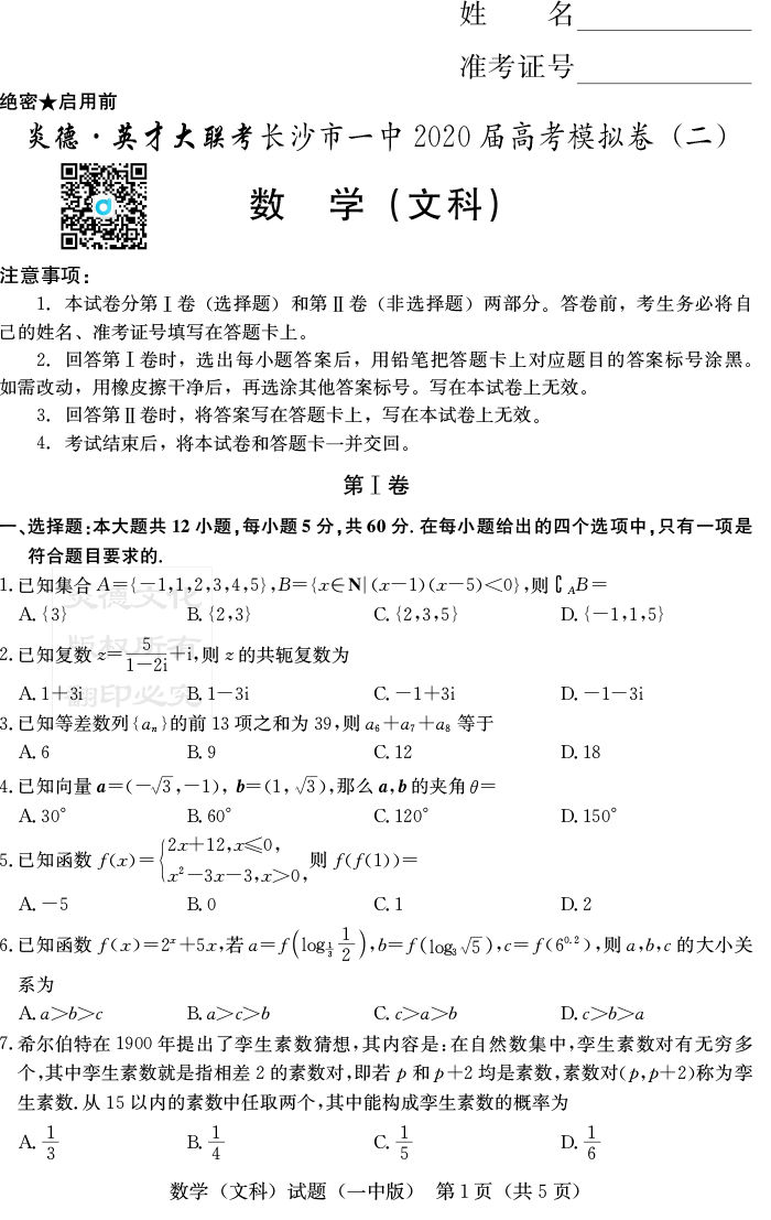 【文數(shù)】炎德英才大聯(lián)考2020屆長沙市一中高三10次月考(模擬二)