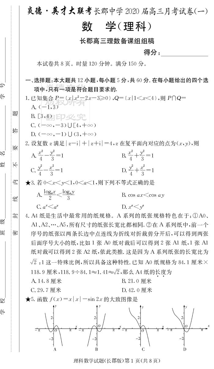 【理數】炎德英才大聯考2020屆長郡中學高三1次月考