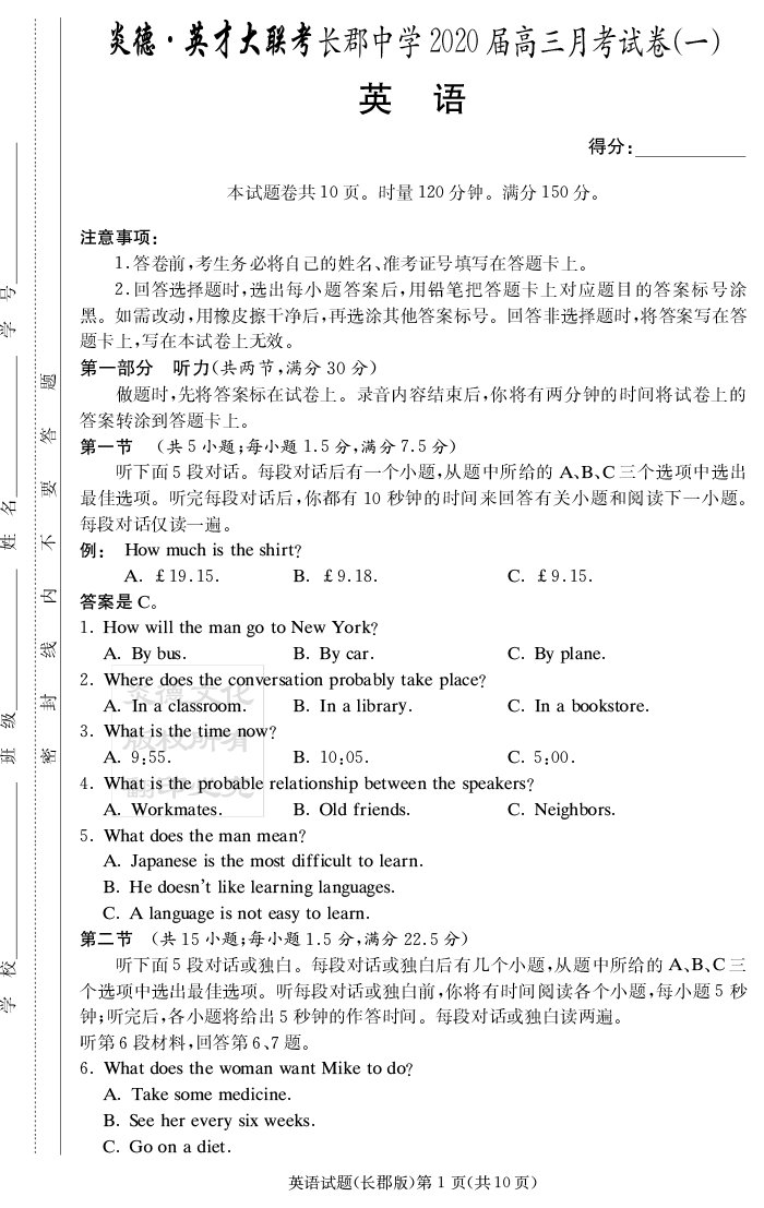 【英語】炎德英才大聯考2020屆長郡中學高三1次月考