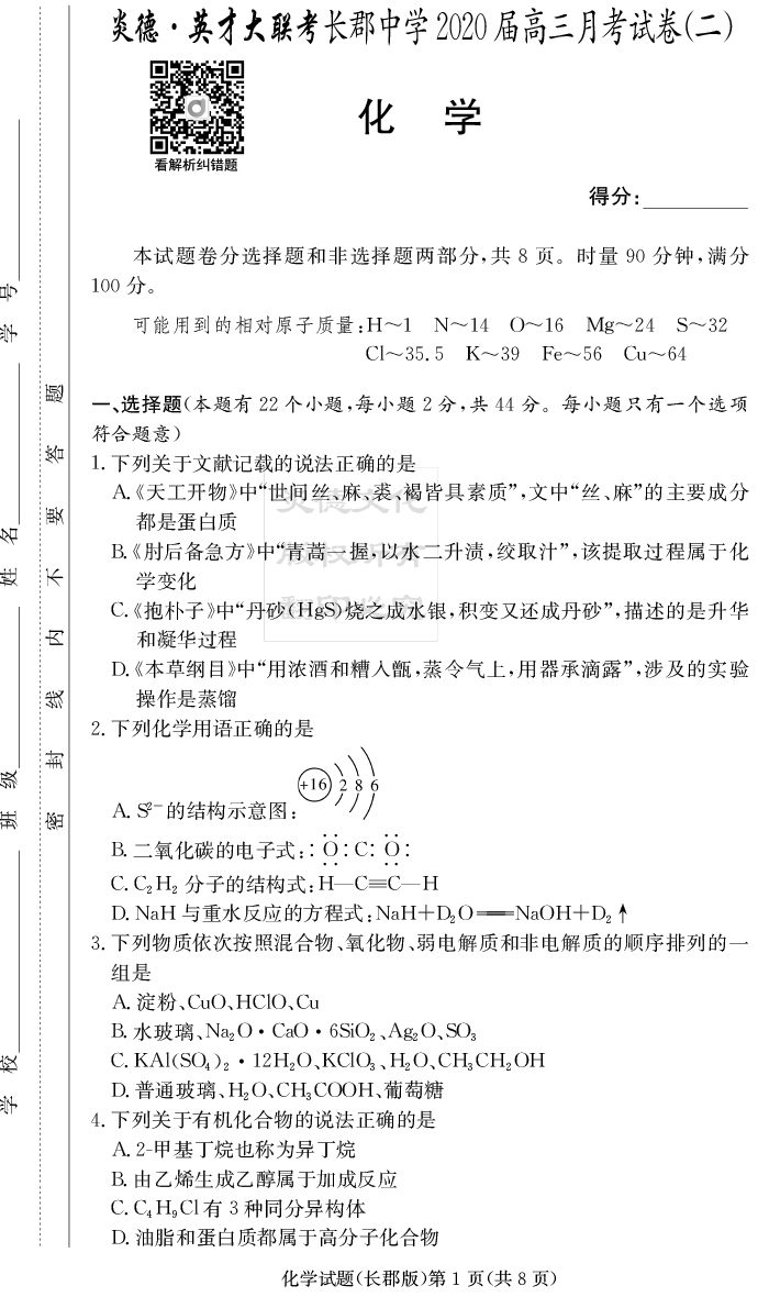 2026長郡中學新高考考前小題沖刺訓練·化學