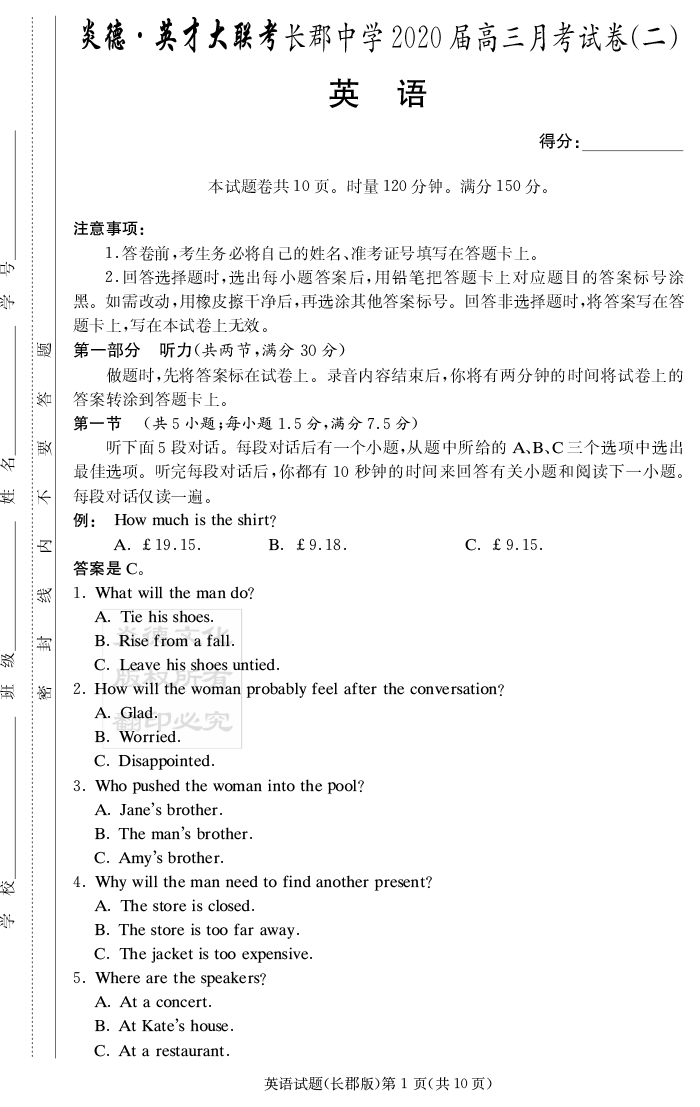 【英語】炎德英才大聯(lián)考2020屆長郡中學(xué)高三2次月考