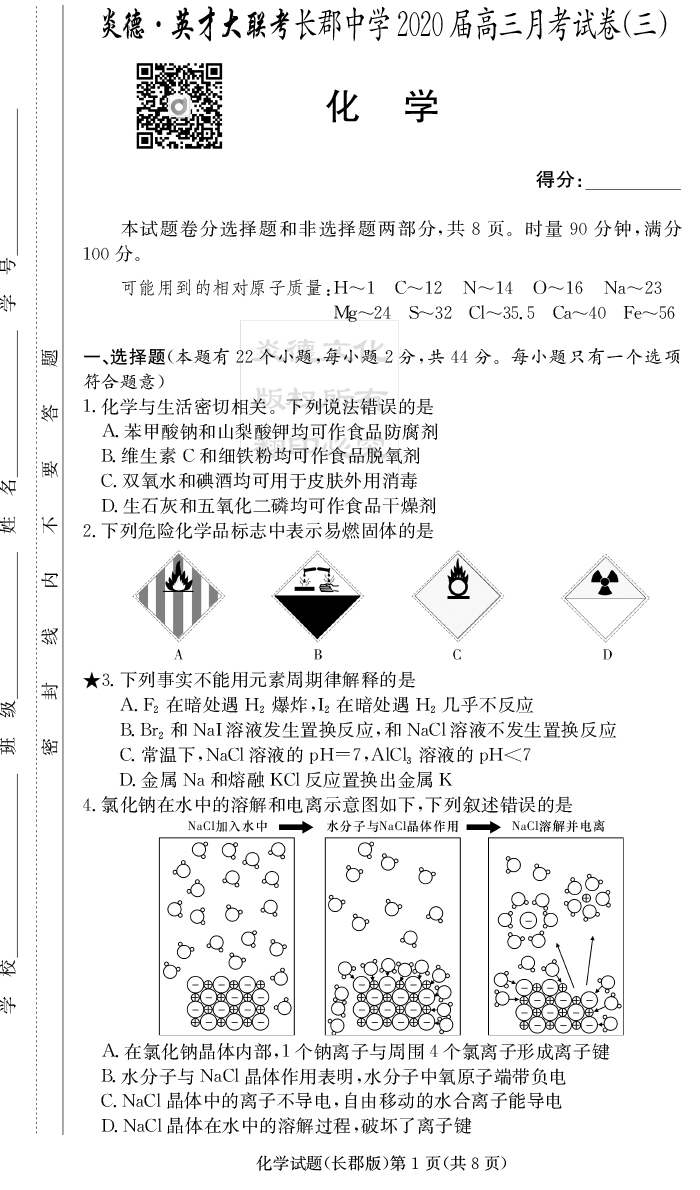 【化學】炎德英才大聯考2020屆長郡中學高三3次月考