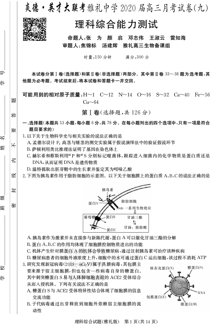【理綜】炎德英才大聯(lián)考2020屆雅禮中學(xué)高三9次月考