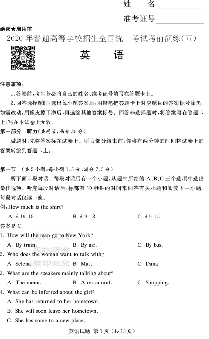 下一篇:【語文】2020年普通高等學校招生全國統一考試考前演練(五)
