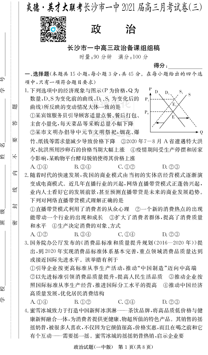2026湖南師大附中新高考考前小題訓練·政治