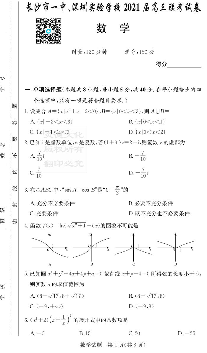 【數(shù)學(xué)】炎德英才大聯(lián)考2021屆長沙市一中高三4次月考
