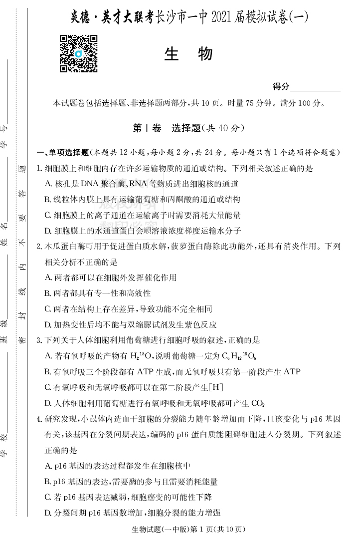 2026湖南師大附中新高考考前小題訓練·生物