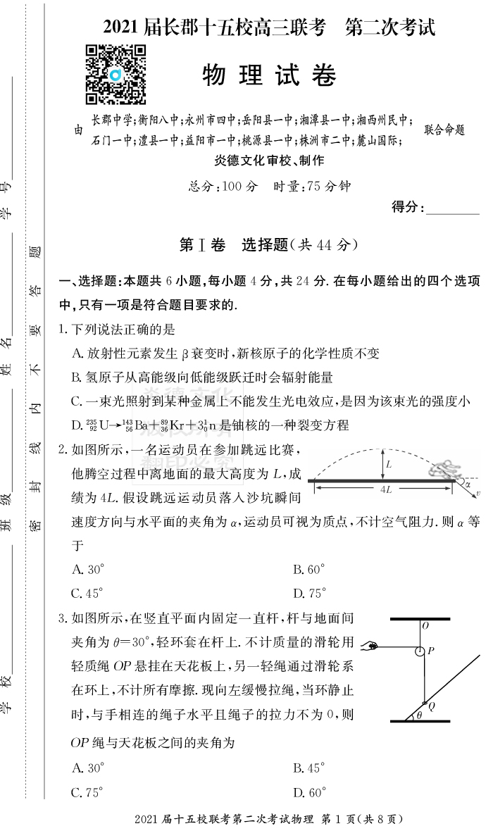 【物理】炎德英才大聯考2021屆長郡中學高三8次月考(十五校聯考二)