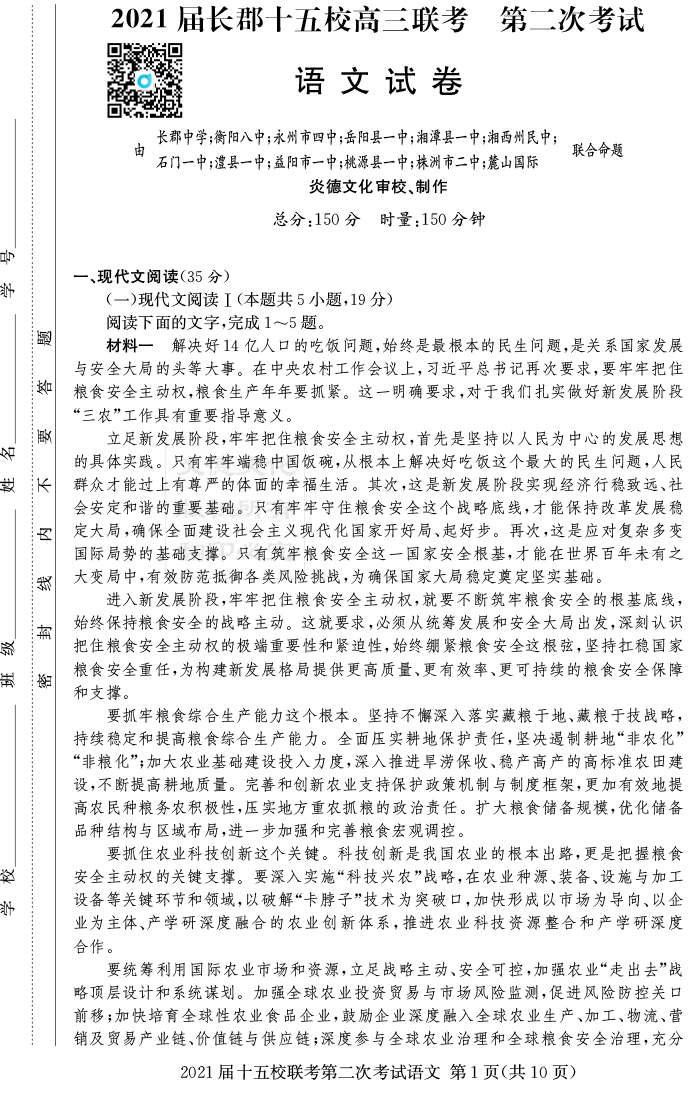 【語文】炎德英才大聯(lián)考2021屆長郡中學(xué)高三8次月考(十五校聯(lián)考二)