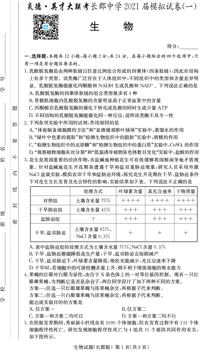 2026湖南師大附中新高考考前小題訓練·生物