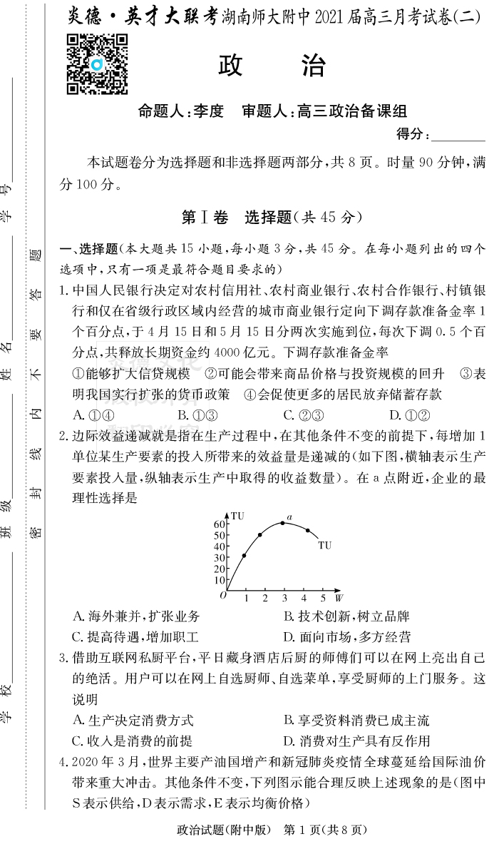 【政治】炎德英才大聯(lián)考2021屆湖南師大附中高三2次月考