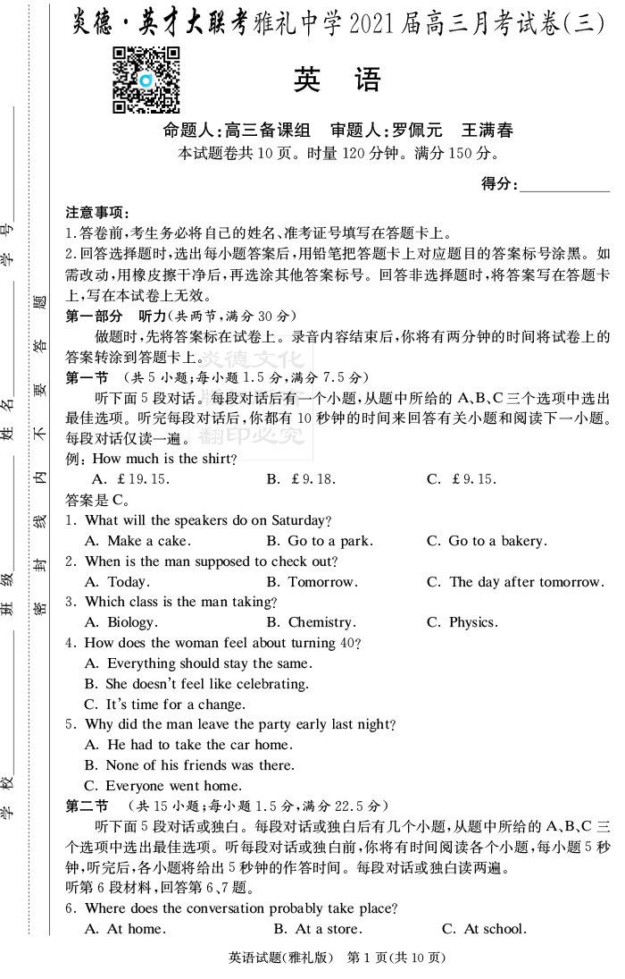 【英語(yǔ)】炎德英才大聯(lián)考2021屆雅禮中學(xué)高三3次月考
