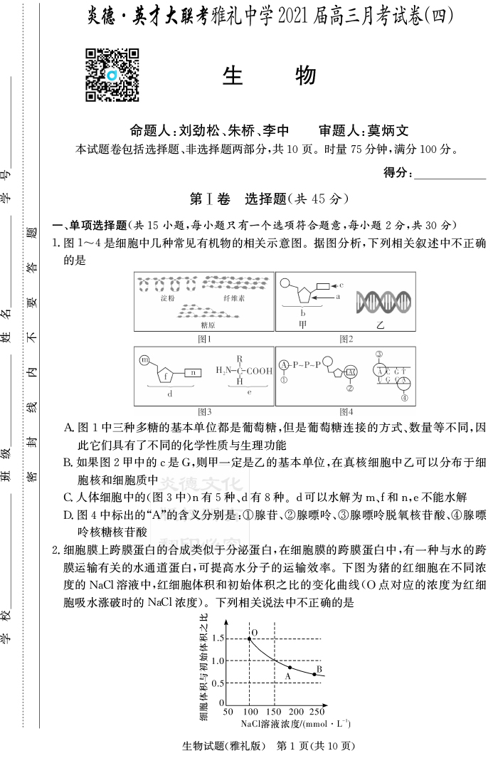 【生物】炎德英才大聯考2021屆雅禮中學高三4次月考
