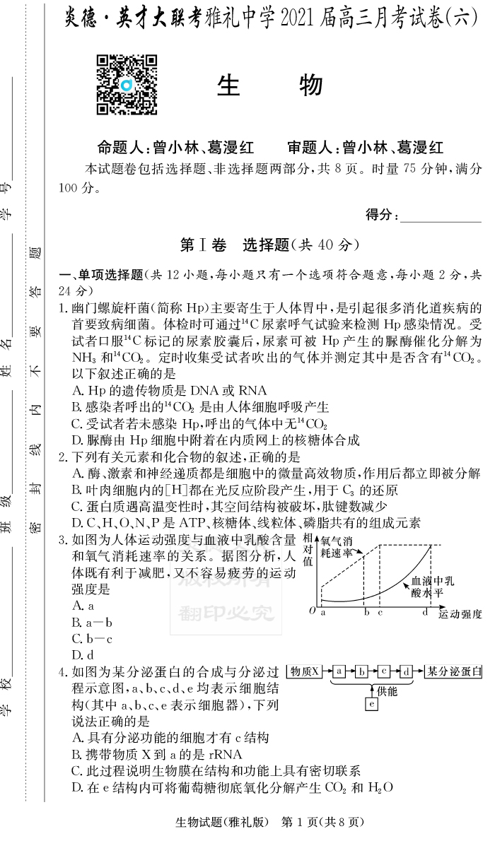 【生物】炎德英才大聯考2021屆雅禮中學高三6次月考