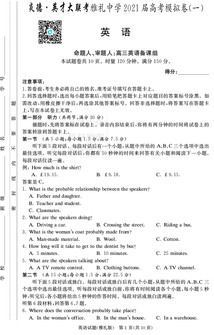 下一篇:【語文】炎德英才大聯考2021屆雅禮中學高三9次月考(模擬一)