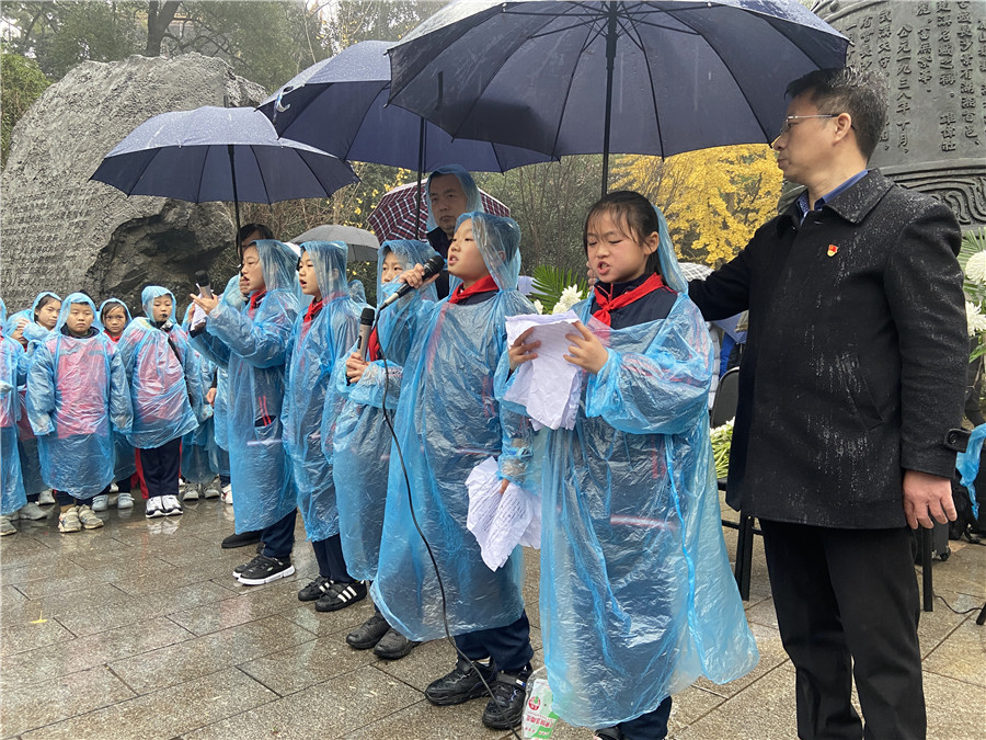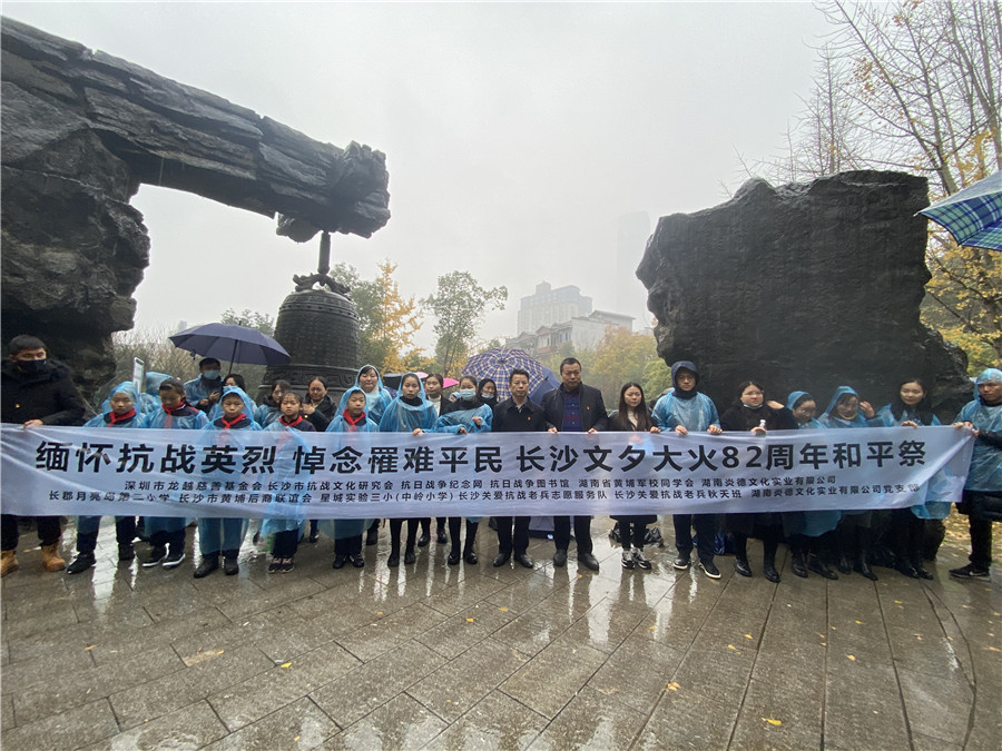 12月13日上午十點,長沙市抗戰文化研究會發起的緬懷抗戰英烈和悼念文夕大火罹難平民儀式在天心公園警世鐘下舉行。參加舉辦本次活動的還有深圳市龍越慈善基金會、湖南省黃埔軍校同學會、長沙市黃埔后裔聯誼會、長沙天心閣公園管理處、抗日戰爭紀念網、抗日戰爭圖書館、星城實驗三小(中嶺小學)、長郡月亮島第二小學、長沙關愛抗戰老兵志愿服務隊、長沙關愛抗戰老兵秋天班、湖南炎德文化實業有限公司、湖南炎德文化實業有限公司黨支部。參加活動的嘉賓還有原湖南省政協副主席、中國國民黨革命委員會第十二屆中央委員會委員劉曉、抗戰老兵陳忠民、房可吉。共有上述舉辦單位的領導、志愿者、學生、老師、黃埔后裔以及市民共計三百余人冒雨參加了本次活動!