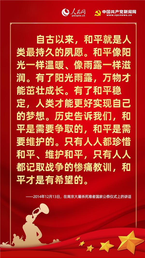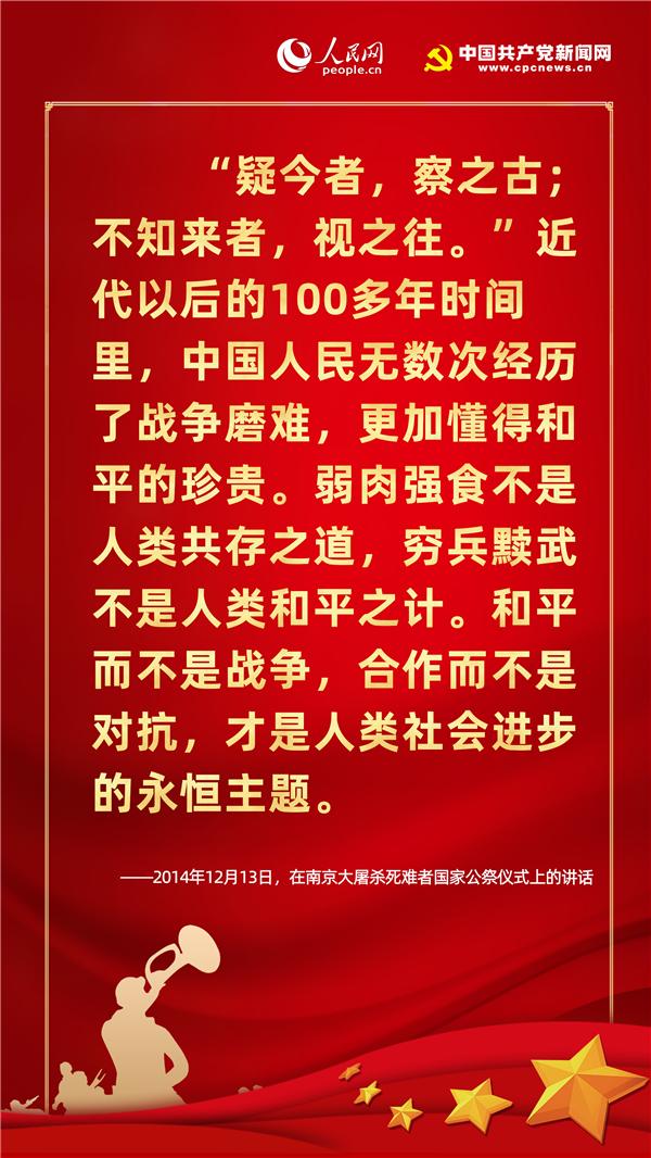 歷史不僅關(guān)乎過去,更關(guān)乎現(xiàn)在和未來。紀念歷史不是為了咀嚼苦難、延續(xù)仇恨,而是為了重申和平與正義的價值,從歷史中汲取智慧,獲得開創(chuàng)未來的精神力量。在七七事變83周年的今天,人民網(wǎng)·中國共產(chǎn)黨新聞網(wǎng)梳理十八大以來習近平總書記有關(guān)“戰(zhàn)爭與和平”的重要論述,讓我們一起“銘記歷史、緬懷先烈、珍視和平、警示未來”。