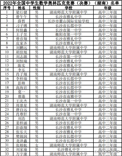 據(jù)中國(guó)數(shù)學(xué)會(huì)發(fā)布的官方公布的名單,今年湖南省進(jìn)入數(shù)學(xué)奧林匹克競(jìng)賽決賽的人數(shù)有33人。