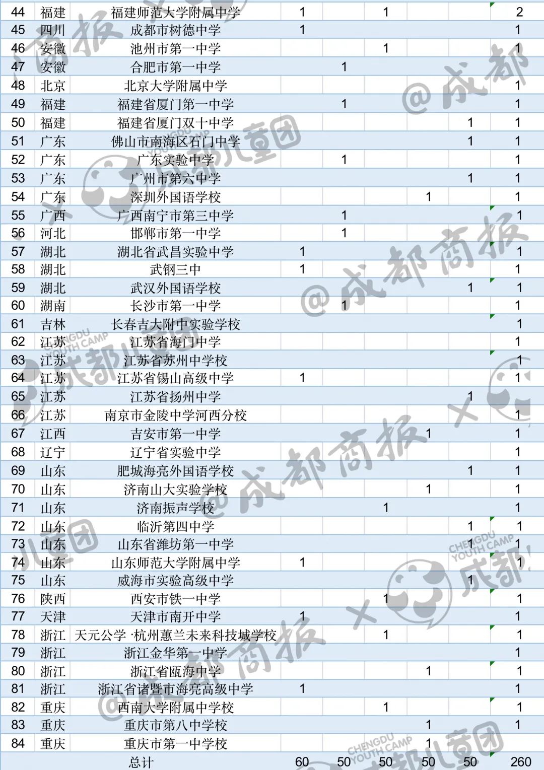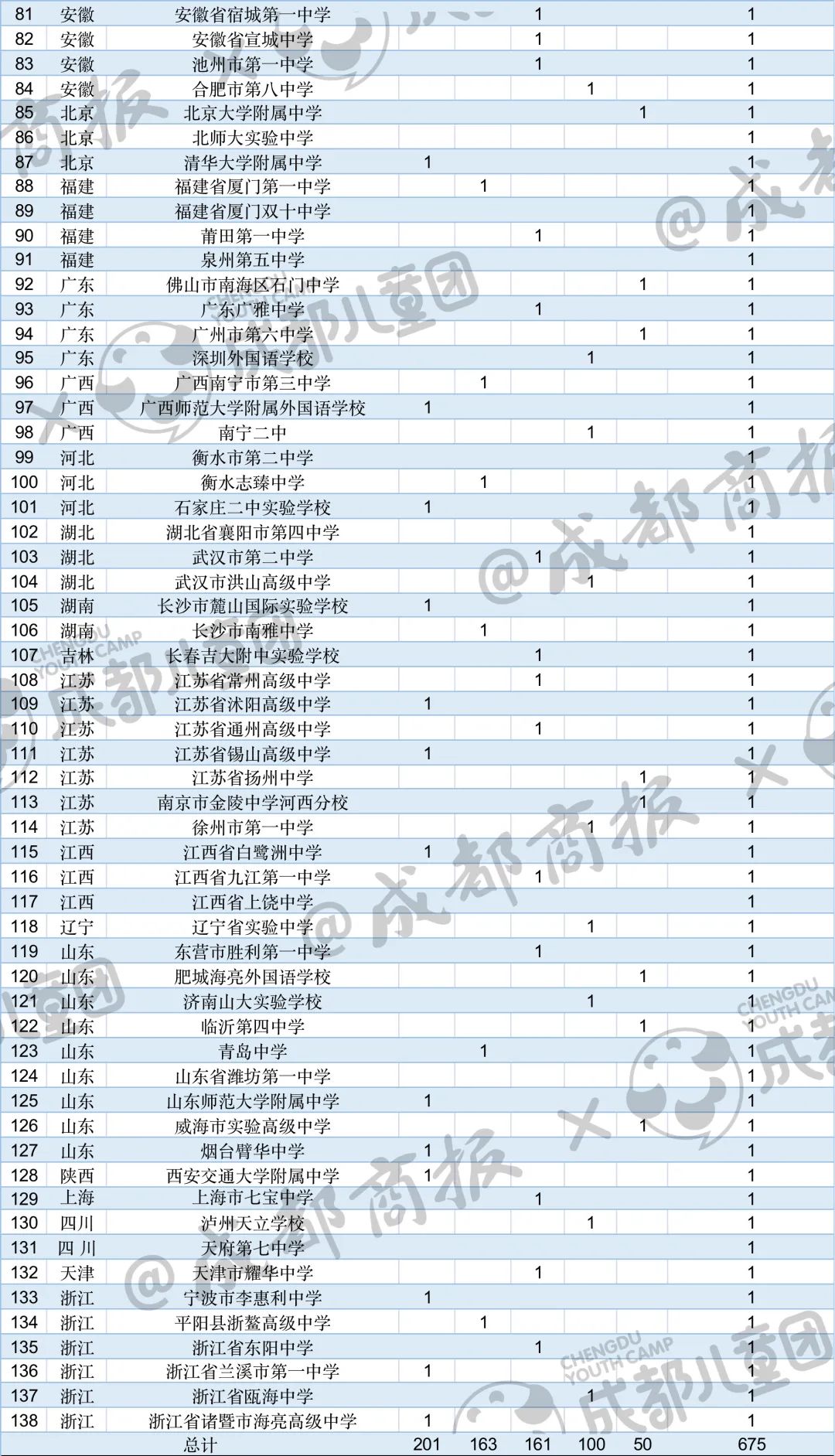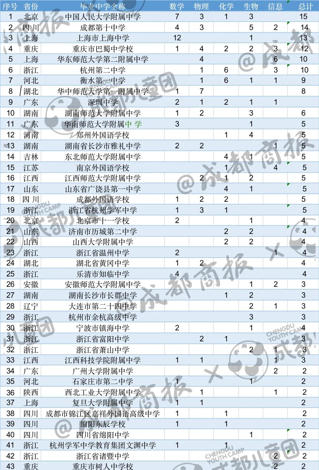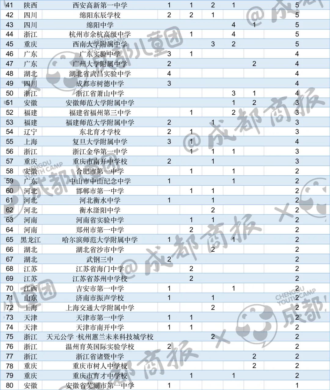 我們也單獨(dú)找出了四川的數(shù)據(jù),2022年,入圍“國(guó)集”的達(dá)到了26人,比去年增加9人,來自成都第七中學(xué)校、成都市樹德中學(xué)、成都外國(guó)語學(xué)校、成都市錦江區(qū)嘉祥外國(guó)語高級(jí)中學(xué)、綿陽中學(xué)、綿陽東辰學(xué)校等。