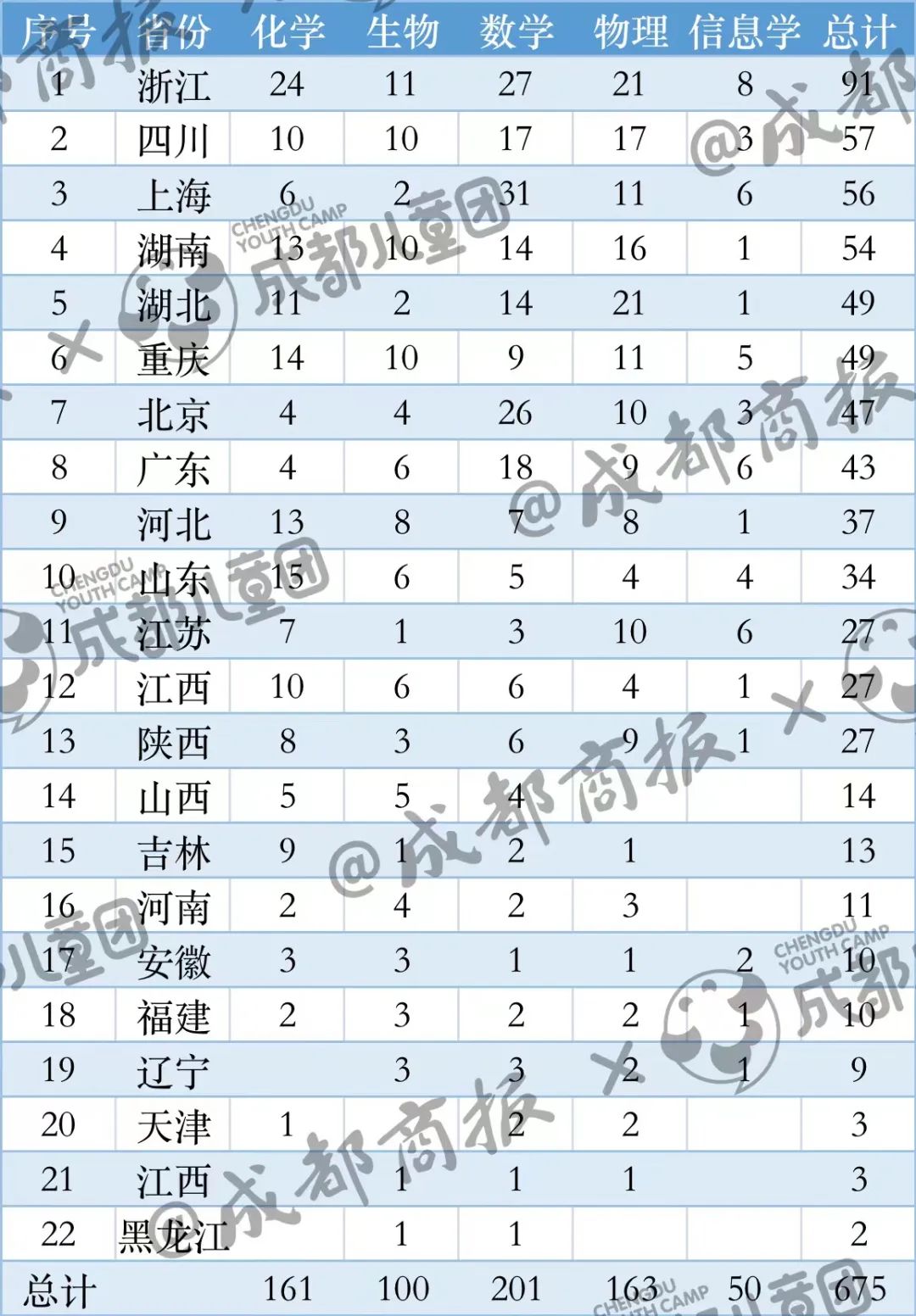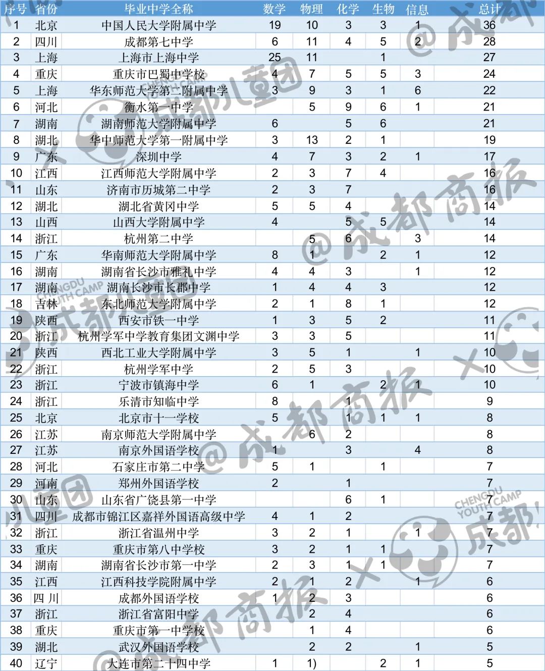 那么,在這場(chǎng)堪稱國(guó)內(nèi)高中生最頂尖的學(xué)術(shù)性比賽中,哪些高中擠入了國(guó)內(nèi)的頭部梯隊(duì)?又有哪些城市的綜合實(shí)力最強(qiáng)呢?成都商報(bào)教育發(fā)布記者僅以2022年全國(guó)中學(xué)生五項(xiàng)學(xué)科競(jìng)賽為例,對(duì)2022年的高中五大學(xué)科競(jìng)賽進(jìn)行了數(shù)據(jù)分析。