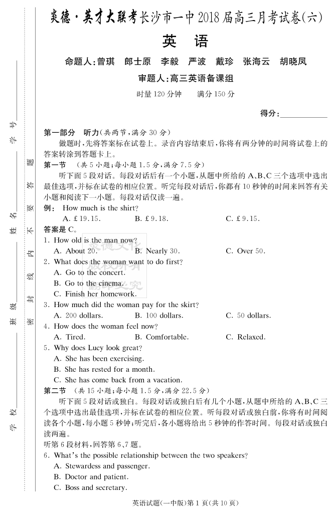 【英語】炎德英才大聯考2018長沙一中高三6次月考