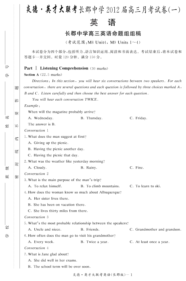 【英語】炎德英才大聯考2012長郡中學高三1次月考